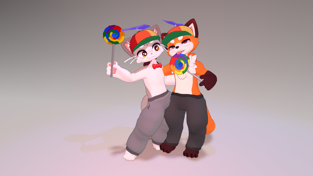 This is a clothing set for the Jinxed Kitty & Fox avatar's, it comes with a t-shirt, sweatpants, mask and cap. With a silly addition giving you a propeller cap, swirly pop and a bowtie!