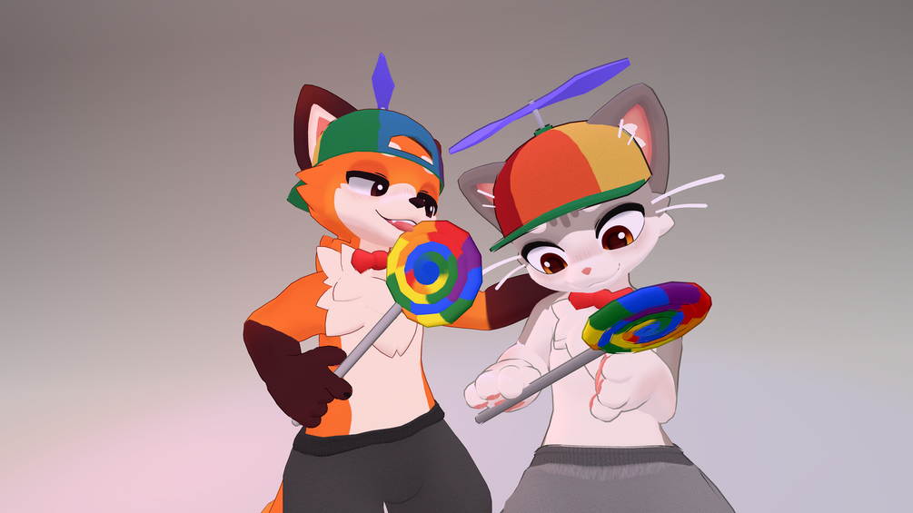 This is a clothing set for the Jinxed Kitty & Fox avatar's, it comes with a t-shirt, sweatpants, mask and cap. With a silly addition giving you a propeller cap, swirly pop and a bowtie!